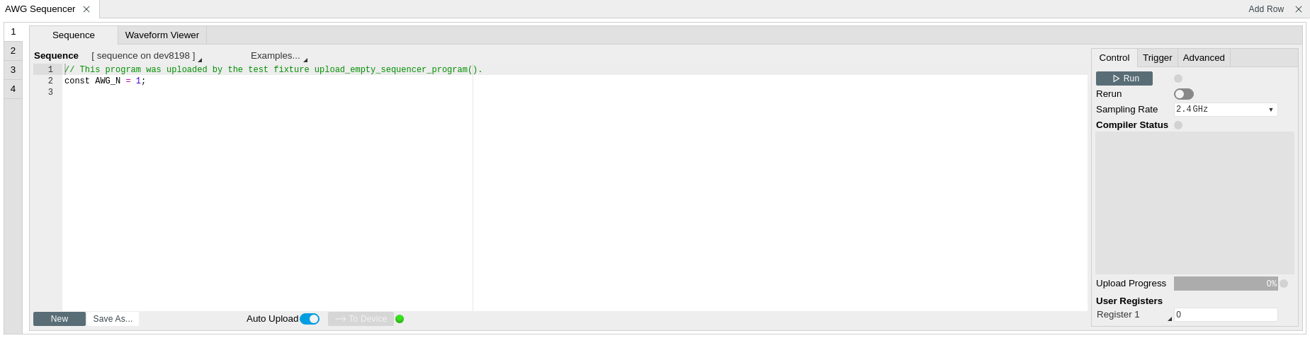 The AWG Sequencer tab (see Figure 1) consists of a settings section on the right side and the Sequence and Waveform Viewer sub-tabs on the left side. The settings section is further divided into Control, Waveform, Trigger, and Advanced sub-tabs. The Sequence sub-tab is used for displaying, editing and compiling a LabOne sequence program. The sequence program defines which waveforms are played and in which order. The Sequence Editor is the main tool for operating the AWG.